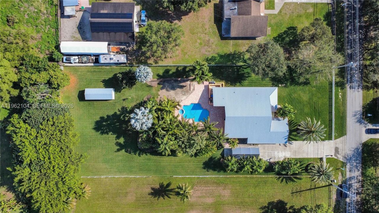 This stunning and meticulously maintained 4-bedroom, 2-bath home sits on 0.88 of an acre on a beautifully fenced property in a peaceful, highly desirable West Davie neighborhood that welcomes horses and all animals and offers the freedom of no HOA. The driveway leads to an ample and lush backyard setting. Major upgrades provide exceptional peace of mind, including a standing seam metal roof (2024), remodeled pool with new heater and pool lights (2025), hurricane-impact windows and doors (2023), ...This stunning and meticulously maintained 4-bedroom, 2-bath home sits on 0.88 of an acre on a beautifully fenced property in a peaceful, highly desirable West Davie neighborhood that welcomes horses and all animals and offers the freedom of no HOA. The driveway leads to an ample and lush backyard setting. Major upgrades provide exceptional peace of mind, including a standing seam metal roof (2024), remodeled pool with new heater and pool lights (2025), hurricane-impact windows and doors (2023), additional hurricane panels and hardware for all openings and an alarm system, a hurricane-impact garage door with new opener (2023), and a two-year-old water heater. The freshly painted 2-car garage features epoxy flooring, New Age metal cabinets with stainless countertops, and an optional Advantage 9000-lb 4-post car lift, with the washer and dryer included. Inside, the kitchen offers generous cooking space with ample cabinetry, a pantry, KitchenAid appliances, and new quartz countertops and windowsills, while the living room showcases French doors overlooking a large, covered patio and pool, along with a divider that creates an additional front living space accented by custom artwork on the entry door. The spacious master bedroom with French doors sits off the main living area, cabana bath features a new quartz countertop, vanity, lighting, shower, and a custom stained-glass window.
